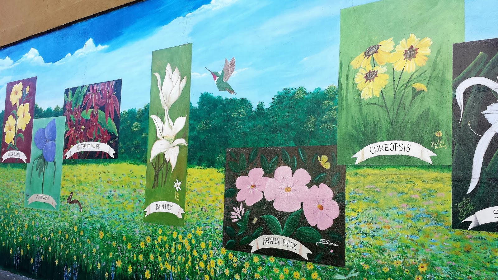 As we rode our bikes through town, we came upon building art. One with all kinds of blooming flowers (first two below) and across the street an olden day river scene of The Columbine, a paddle wheeler, moving goods and people up and down the river (last pic below).